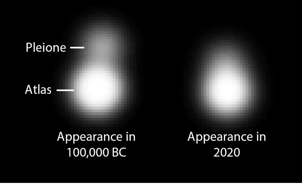 現在と10万年前のプレアデス星団の星の位置。左のプレオネ星は、紀元前10万年にはアトラスから少し離れていたため、より見やすくなっている。レイ・ノリス