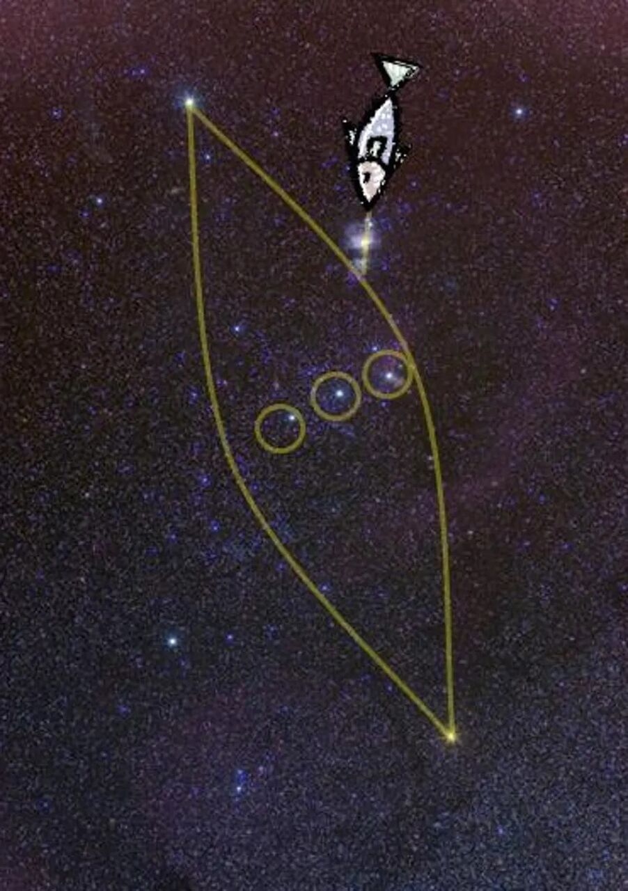 北オーストラリアのヨォルング族によるオリオン座の解釈。オリオン座の3つの星は、カヌーで釣りに出かけた3人の若者が、オリオン大星雲で表される禁断のキングフィッシュを釣り上げたことを表しています。ヨォルング族の口承文芸をもとにレイ・ノリスが描いたもの。